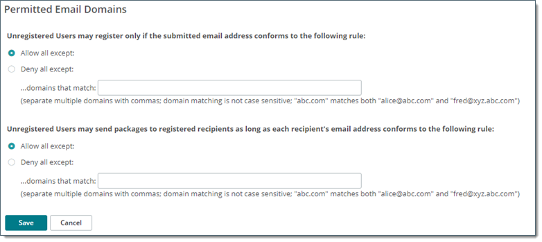 Cette section permet aux administrateurs de limiter les domaines pour les adresses e-mail des destinataires inscrits. Cela aide à éviter que les utilisateurs n'envoient un paquet à certains utilisateurs inscrits alors qu'ils n'y sont pas habilités. La liste de domaines est une liste de domaines délimitée par des virgules servant de référentiel. Les paramètres de règle déterminent si les domaines correspondants seront autorisés ou refusés.