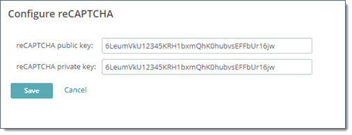 Si reCAPTCHA est activé pour des Expéditeurs non inscrits ou la réinitialisation du mot de passe, n'effacez jamais les champs de la clé reCAPTCHA. Annulez toujours (désactivez) l'utilisation de reCAPTCHA pour les flux de travaux activés par reCAPTCHA avant de supprimer ces clés. Si l'un de ces scénarios utilisateur est activé des clés valides doivent être présentes pour que les modèles reCAPTCHA soient générés et que vos destinataires non enregistrés puissent envoyer des paquets et/ou que des utilisateurs puissent commencer un processus de réinitialisation du mot de passe.