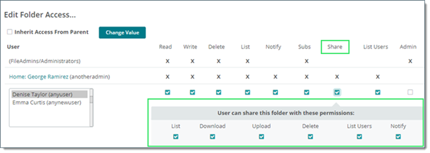 Configure une fonctionnalité dans des dossiers. Les administrateurs peuvent activer/supprimer des permissions particulières de partage pour des utilisateurs individuels associés à des dossiers particuliers.