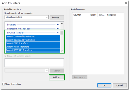 Nouveaux compteurs de performances spécifiques à MOVEit Transfer (affichés depuis Analyseur de performances de Windows Server > Propriétés > Ajouter)