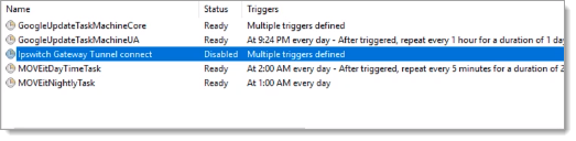 Avant la version 4.0 de MOVEit Gateway (version 2020), MOVEit Transfer utilisait le planificateur de tâches de Windows Server pour initier et maintenir une connexion sécurisée dédiée avec MOVEit Gateway. Cette section vous montre comment supprimer la tâche planifiée et la connexion sécurisée ou l'objet (Gateway Tunnel) du système d'exploitation hôte de Windows Server.