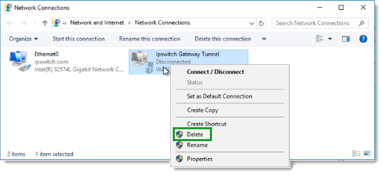 Sélectionnez Ipswitch Gateway Tunnel, faites un clic droit et sélectionnez Supprimer dans le menu déroulant.