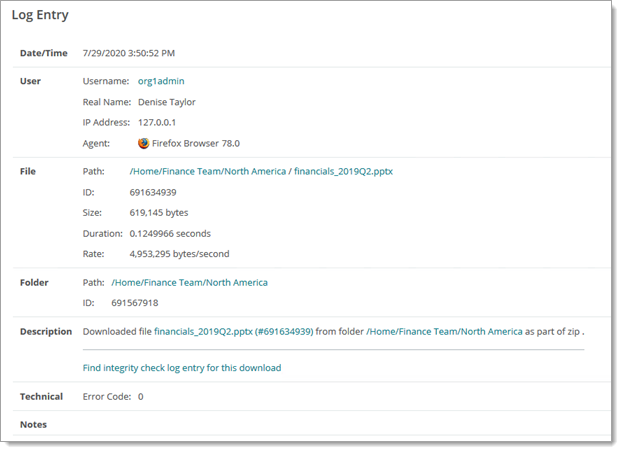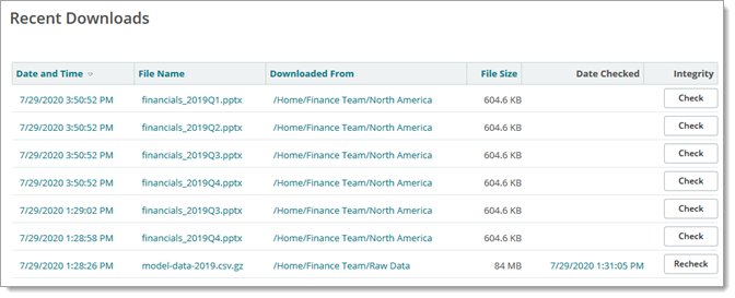 Une description de l'action de téléchargement, et un lien vers Rechercher l'entrée de journal du contrôle d'intégrité de ce téléchargement (le cas échéant) pour afficher tous les contrôles d'intégrité du téléchargement