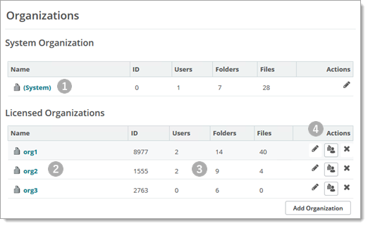 Seuls les administrateurs système sont autorisés à ajouter ou à supprimer des organisations. Les administrateurs système et les administrateurs sont habilités à configurer les organisations, mais certaines informations, comme le nom et le niveau de chiffrement SSL minimum, peuvent uniquement être définies par les administrateurs système.
