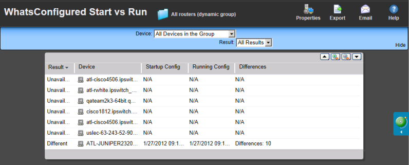 WhatsConfigured 起動と実行の設定レポートは、特定のデバイスグループにあるデバイスの起動時と実行中の設定スクリプト間の相違を図示します。