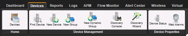 The Devices tab is where you go to view and manage your network devices. The Devices page displays discovered device groups in list form and graphical form in the Details View and a Map View. The Device Management pages allow you to interact with and configure your network device groups by searching for particular devices, creating new groups and devices, and performing new discovery scans using either the Discovery Console or the Discovery Wizard. The Device Properties pages take you to the Device Status and Web Alarms dashboard views, where you can view dashboard report information for a specific device and currently running web alarms for all network devices.