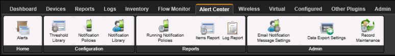 The Alert Center tab is where you go to configure and view WhatsUp Gold Alert Center, which handles alerting on performance monitors, passive monitors, system health, Flow Monitor, and Wireless through user-defined thresholds and notification policies. The Alerts page displays all currently configured thresholds and any running notification policies. You can filter the Alerts page to view only thresholds and alerts pertaining to specific types of thresholds, only thresholds that are out of the specified threshold criteria boundaries, or only thresholds that are in the specified threshold criteria boundaries. The information Alert Center gathers is displayed in the Reports pages. Use the Configuration pages to configure Alert Center thresholds and notification and the Admin pages to configure data and emails settings and to perform database maintenance.