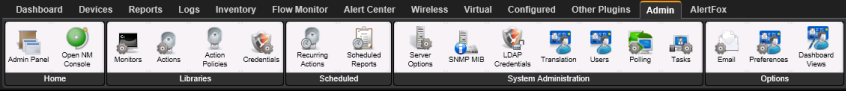 The Admin tab is where you go to perform all administrative tasks associated with WhatsUp Gold. The tab is broken down into 5 types of pages: