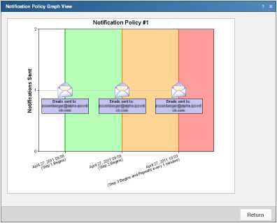 Y (縱) 軸顯示針對規則每個步驟所傳送的電子郵件通知。X (橫) 軸顯示執行每個規則步驟的時間。
