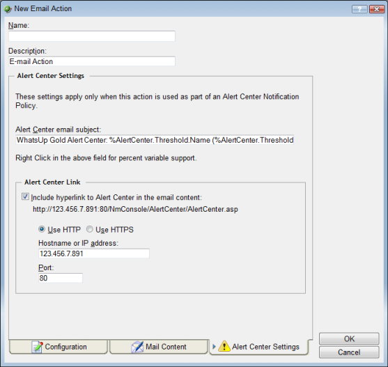 Alert Center email notifications and WhatsUp Gold email actions use the same configuration dialog.