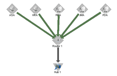 In the example above, the devices have an up dependency on the router, and the router has a down dependency on the hub. If the router's active monitors fail, the hub would be polled, and the devices behind the router would not be polled. When the router's active monitors are successful, the hub is not polled, but the devices behind the router are.
