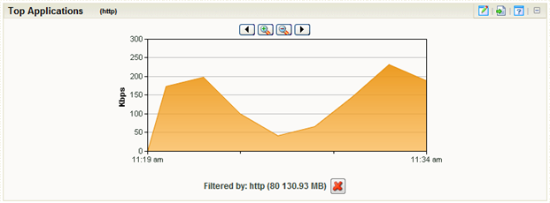 After you apply a filter to the Interface Details report, the workspace report that coincides with the filter reloads with a time graph for the filtered traffic component. For example, if you apply a filter for the http application, the Top Applications workspace report displays a time graph of http application use for the time period selected at the top of the Interface Details report.