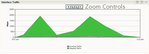 Workspace reports that include line graphs, such as the Interface Traffic report, allow you to adjust the window of time for which data is reported using the zoom controls. These controls are located at the top center of the workspace report.
