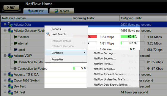 From the NetFlow Monitor Home page, you can right-click on a source or interface to access a right-click menu with links to common tasks.