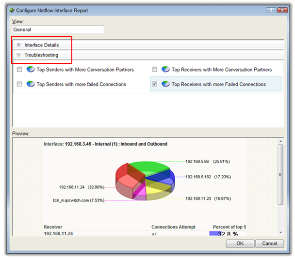 If you add workspace reports to the Interface Details report in NetFlow Monitor, you see Interface Details and Troubleshooting categories on the Configure NetFlow Interface Report dialog.