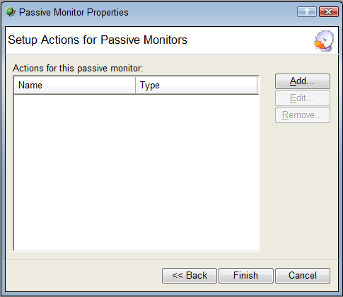 - On the Passive Monitors dialog, either a new Passive Monitor, or an existing monitor. In both situations, after selecting the Passive Monitor type via the Passive Monitor Properties, you are directed to setup Actions for the selected Passive Monitor.