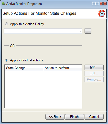 - On the Active Monitors dialog, either a new Active Monitor, or an existing monitor. In both situations, after setting the monitor's polling properties via the Active Monitor Properties, you are directed to setup Actions for the selected Active Monitor.