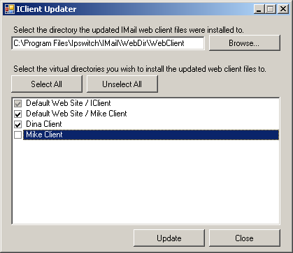 Update. Click update to copy the contents of the new IMail web client to the selected web sites.