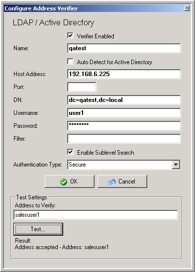 "Not checked" as this verifier is not on the specified domain."qatest" Name set to identify the LDAP Verifier."192.168.6.225" The IP address of the Active Directory server. "dc=qatest,dc=local" The domain component that will be connected and queried. "user1" Credentials to be used to connect. "Enabled" To search the current container and all sub containers indicated by the DN.