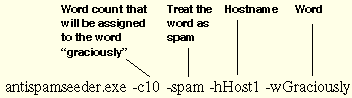 If you want to alter the entry for the word "graciously" in the antispam-table.txt file so it is treated as spam , enter the following command (where 10 is the word count that you want to assign to the word "graciously", "Host1" is the hostname, and "graciously" is the word).